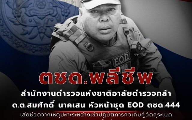 เมื่อวันที่ 15 ตุลาคม 2568 ที่ผ่านมา สำนักงานตำรวจแห่งชาติ เผยเเพร่รูปภาพพร้อมข้อความ อาลัยตำรวจกล้า สดุดี ตชด.พลีชีพ ผ่านเพจเฟซบุ๊ก สำนักงานตำรวจแห่งชาติ โดยระบุว่า สำนักงานตำรวจแห่งชาติขอแสดงความเสียใจอย่างสุดซึ้งต่อครอบครัวของ ด.ต.สมศักดิ์ นาคเสน หัวหน้าชุด EOD ตชด.444