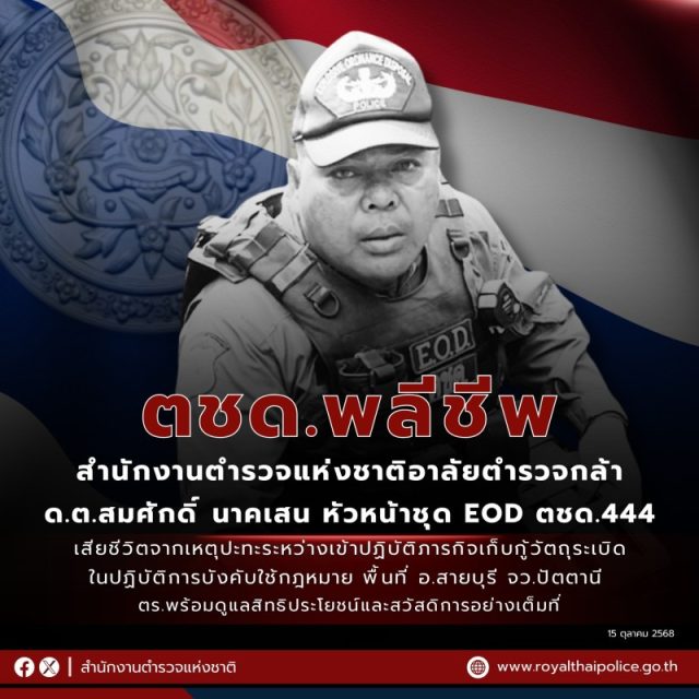 เสียชีวิตจากเหตุปะทะระหว่างเข้าปฏิบัติภารกิจเก็บกู้วัตถุระเบิด ในปฏิบัติการบังคับใช้กฎหมาย พื้นที่ อ.สายบุรี จว.ปัตตานี เมื่อวันที่ 15 ตุลาคม 2568 สำนักงานตำรวจแห่งชาติสดุดีในความกล้าหาญ ทุ่มเท โดยพร้อมดูแลสิทธิประโยชน์และสวัสดิการอย่างเต็มที่