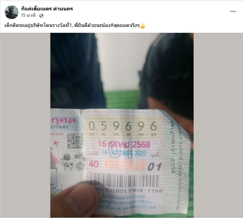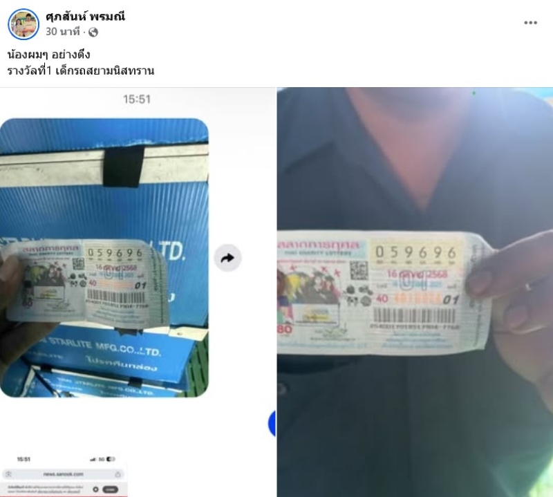 ล่าสุด โลกออนไลน์มีการแชร์โพสต์ของผู้ใช้เฟซบุ๊กรายหนึ่งชื่อ ศุภสันห์ พรมณี ซึ่งได้โพสต์ภาพผู้โชคดีถูกรางวัลที่ 1 พร้อมระบุข้อความว่า น้องผมๆ อย่างตึง รางวัลที่1 เด็กรถสยามนิสทราน