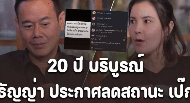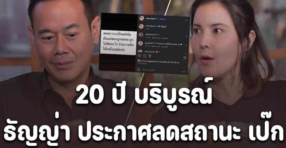 เกิดอะไรขึ้น หลังจู่ๆ ธัญญ่า ธัญญาเรศ ประกาศลดสถานะ เป๊ก ผ่านอินสตาแกรมส่วนตัว ระบุว่า ลดสถานะเป็นแค่พ่อกับแม่ของลูกนะคะ ลูกไม่ติดอะไร ร่วมงานกันได้เหมือนเดิมค่ะ พร้อมแคปชั่นว่า 20ปี บริบูรณ์